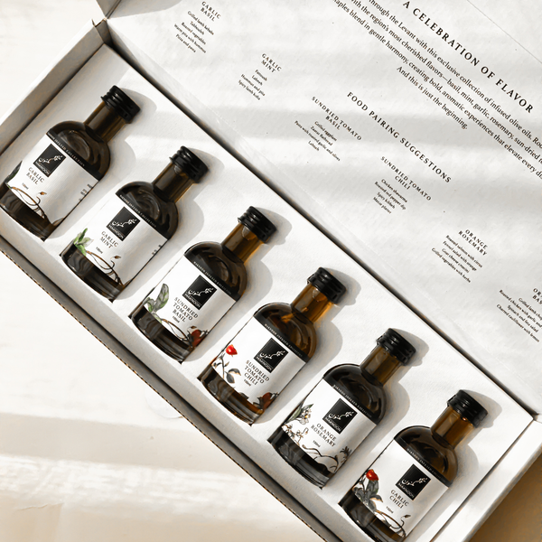 A sensory journey through the Levant with this exclusive collection of infused olive oils from Maknoon. Each bottle blends their beloved Lebanese olive oil with the region's most cherished flavours — basil, mint, garlic, rosemary, sun-dried ingredients, orange, and more. An exceptional gift and a gourmet addition to any kitchen.